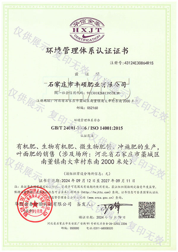 石家莊市豐碩肥業(yè)有限公司是一家集新型肥料的研發(fā)、制造、營銷、服務(wù)于一體的高新技術(shù)企業(yè),公司自2008年創(chuàng)辦以來,一直致力于新型肥料的技術(shù)研發(fā)和市場推廣。公司組建了豐碩新型肥料研究中心(院士專家企業(yè)工作站),自主知識產(chǎn)權(quán)研發(fā)團(tuán)隊專業(yè)科研人員20余人,獲得了多項肥料國家發(fā)明專利。公司目前已擁有發(fā)酵類有機肥、微生物菌劑、生物有機肥、土壤調(diào)理劑、大量元素水溶肥、含腐植酸肥料、含氨基酸肥料、中微量元素肥料等8大品類,“金維克”、“豐碩沃農(nóng)”等2大自有品牌,擁有20多個暢銷品種。目前,我公司已經(jīng)通過了“ISO9001 質(zhì)量管理體系認(rèn)證”、“ISO14001 環(huán)境管理體系認(rèn)證”、“OHSAS18001 職業(yè)健康管理體系認(rèn)證”。...